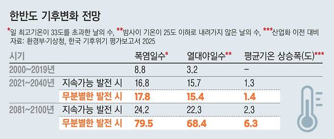한반도가 지구 평균보다 훨씬 빠르게 달궈지고 있는 것으로 나타났다. 전문가들은 한반도의 극한 고온 현상은 인간 활동이 원인이라며 탄소배출을 급격히 줄이지 않으면 2100년까지 폭염일은 지금보다 9배, 열대야일은 21배까지 증가할 것으로 전망했다. 환경부와 기상청은 18일 이런 내용이 담긴 ‘한국 기후위기 평가보고서 2025’를 공개했다.