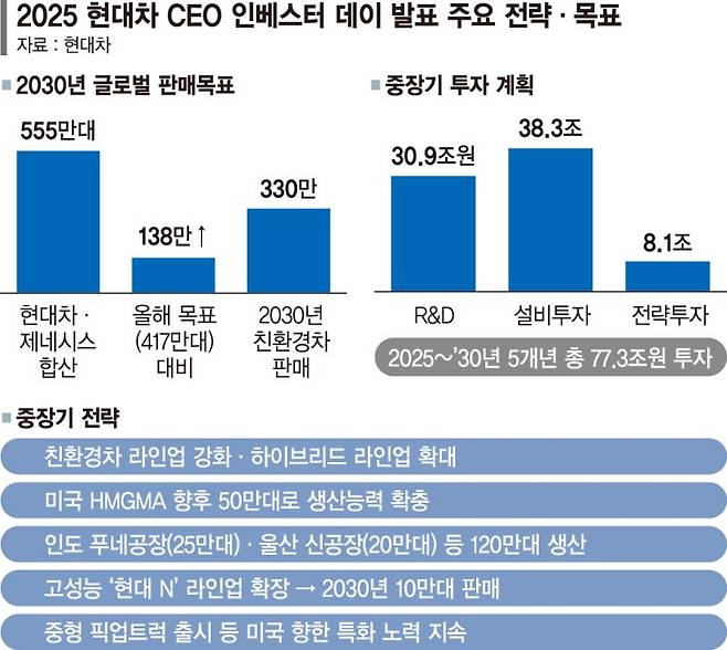글로벌 친환경차 판매의 경우 2025년 100만대 규모에서 2030년 330만대로 점진적으로 확대해 친환경차 판매 비중을 25%에서 60%로 크게 뛰어오를 것으로 현대차는 기대했다.