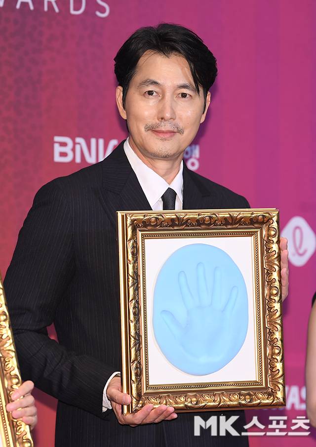 18일 오후 부산 해운대구 시그니엘 부산에서 열린 제34회 부일영화상 핸드프린팅 행사에 참석한 정우성은 수염을 기른 모습으로 등장해 취재진 앞에 섰다.