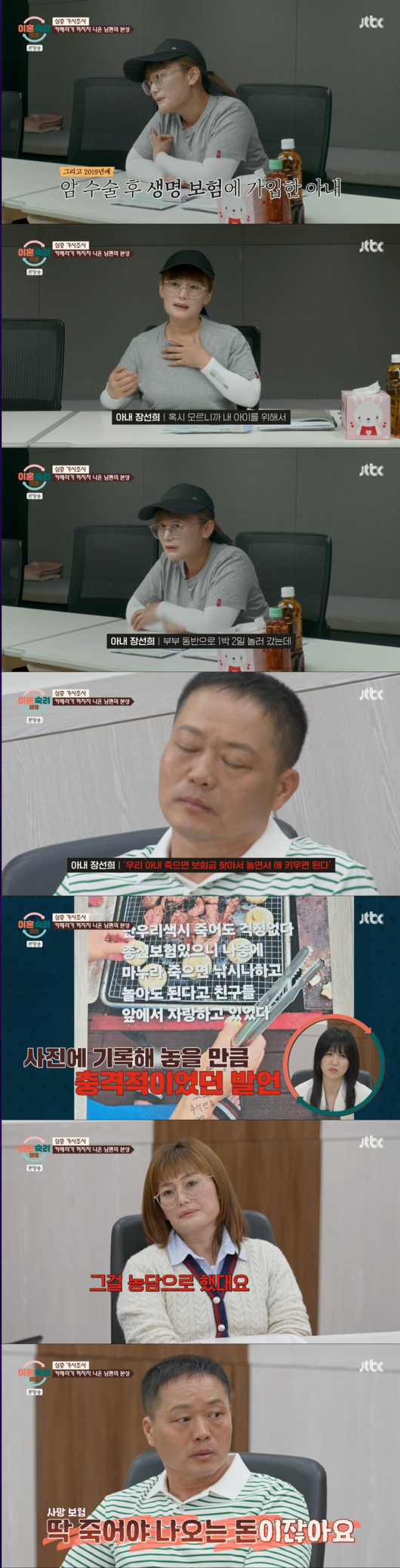 아내는 이 말을 듣고 “이 인간은 그러다가 나를 죽이고도 남겠다”는 생각이 들었다며, 곧바로 보험을 해약했다고 밝혔다. 이에 대해 남편은 "농담으로 한 말"이라고 해명했지만, 아내는 어이없어 하는 모습을 보였다.