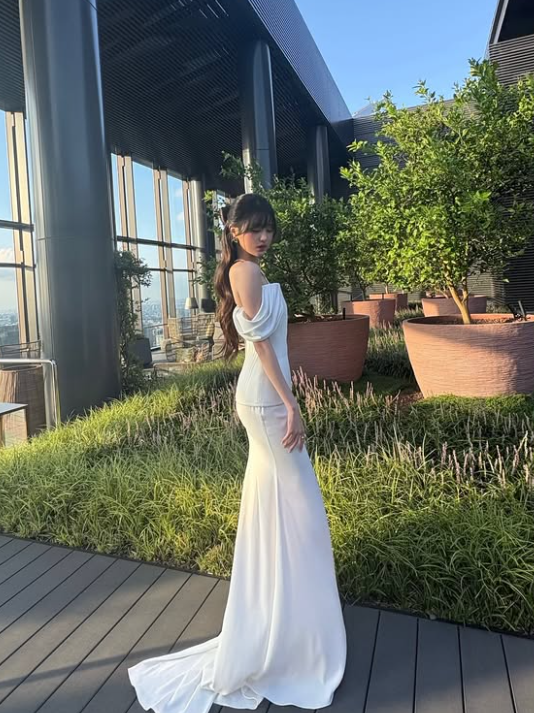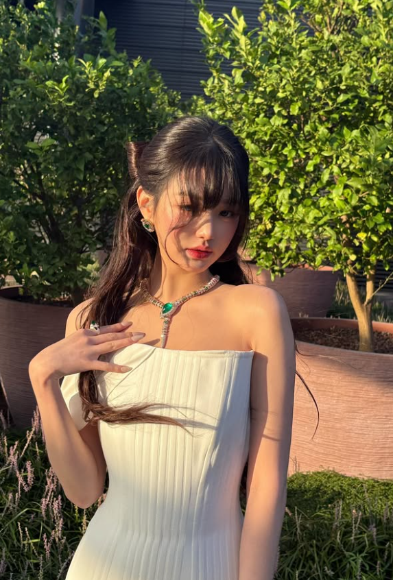 공개된 사진에서 장원영은 오프숄더 화이트 롱 드레스와 초록빛이 돋보이는 귀걸이와 목걸이, 반지를 착용하고, 이에 맞춰 같은 색의 컬러렌즈를 낀 모습이다.