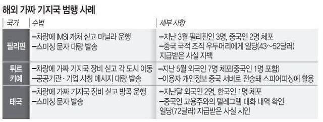 국내에선 전례가 없었던 가짜 기지국 악용 범죄는 이미 해외에선 유사 사례가 이어지고 있다. 지난 5월 튀르키예에서는 차량에 가짜 기지국 장비를 싣고 기업·공공기관을 사칭한 스미싱 문자를 전송한 외국인 7명을 체포했다. 해당 사건 발생 이후 피해자 개인정보가 중국 서버로 전송돼 스피어피싱(특정 개인·조직을 표적화한 사이버 공격)에 사용된 것으로 나타났다. 지난 3월과 8월에는 각각 필리핀, 태국에서 같은 수법으로 범행을 저지른 용의자들이 체포됐다. 이들은 모두 중국 국적의 ‘윗선’으로부터 일당을 지급받았다.