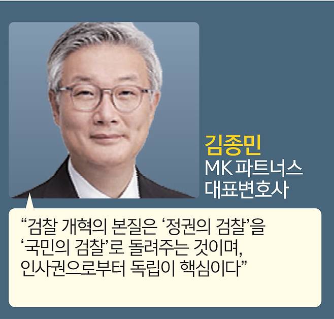 검사 출신 김종민 엠케이파트너스 대표변호사는 “현재 진행되는 검찰 개혁을 보면 검찰 해체에만 집중하고, 신속하고 효과적인 형사·사법, 범죄 피해자를 배려하는 형사·사법에 대해서는 고려하지 않고 있는 것 같다”며 “검찰 개혁은 집권 세력의 정치적 목표를 달성하기 위한 게 아니다. 검찰 개혁의 목표는 첫째도, 둘째도 국민이어야 한다”고 강조했다. 그러면서 김 대표변호사는 “지금까지 검찰의 문제 중 50%는 검찰 스스로의 문제이고, 나머지 50%는 집권 정치세력이 검찰을 정치적 도구로 이용했기 때문이라고 본다”며 “그게 가능했던 건 검찰 인사권이 대통령에게 있어서였다”고 짚었다. 그는 “대통령에게 인사권이 있는 한 (기관 명칭이나 기능이 어떻게 바뀌더라도) 정치적 중립성이나 수사의 공정성을 확보하는 건 영원히 불가능할 것”이라고도 경고했다.
