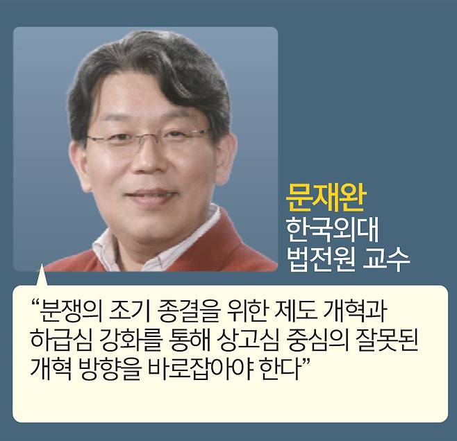 한국헌법학회장을 지낸 문재완 한국외대 법전원 교수는 “현재 사법 개혁의 방향이 틀렸다”며 “어떻게 하면 법원에 우수한 인력을 적재적소에 배치할까, 항고심과 상고심 파기율을 낮출 수 있을까를 고민해야 하는데 지금처럼 재판소원 도입 같은 게 쟁점이 되면 사람들은 하급심을 못 믿고 오히려 상소를 하거나 재판소원을 하려 할 것”이라고 꼬집었다. 문 교수는 “분쟁의 조기 종결을 위한 제도 개혁이 필요하다”며 “하급심 강화가 (올바른 사법) 개혁의 방향이라고 본다”고 강조했다.