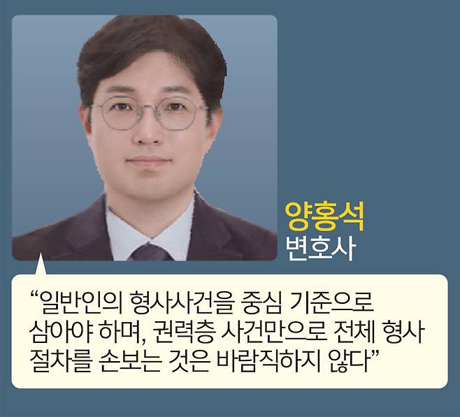 양홍석 법무법인 이공 변호사는 “형사·사법 제도 개편에 있어서 기준점이 권력자들이나 힘 있는 사람들 사건이 돼선 안 된다. 이런 사건에는 검사의 출세 욕심이나 권력 또는 외부의 압력 같은 것들이 개입되기 때문”이라면서 “장삼이사(張三李四·이름이나 신분이 특별하지 않은 평범한 사람들)가 죄를 저질렀을 때, 혹은 범죄 피해자가 됐을 때 그것을 어떻게 처리하는지와 관련된 절차를 중심에 놓고 보다 효과적으로, 적시에 처리할 수 있는 방법을 고민하는 것이 바람직하다”고 말했다.