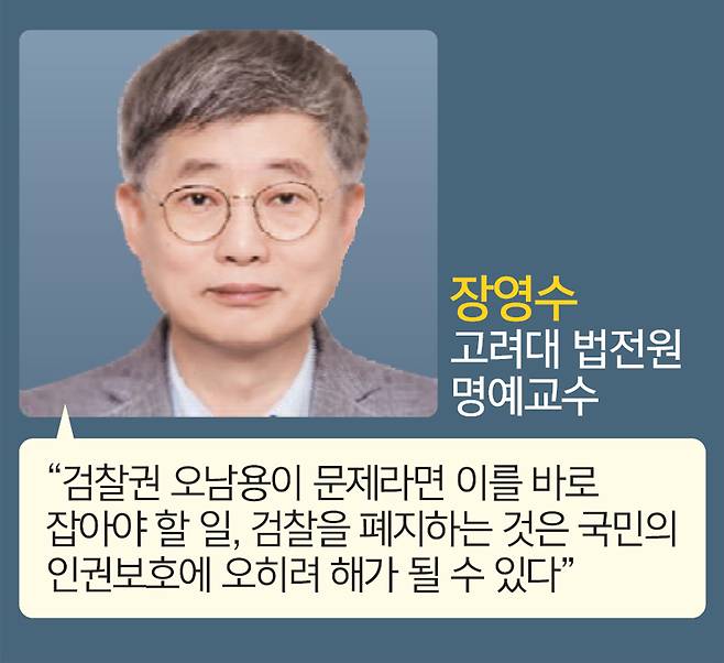 정부·여당이 추진 중인 검찰 개혁에 대해서는 우려하는 목소리가 많았다. 장영수 고려대 법학전문대학원(로스쿨) 명예교수는 “여권은 검찰권 오남용을 이야기하지만, 그렇다고 해서 기관을 폐지하는 게 답은 아니다”라며 “검찰청 폐지로 얻는 것과 잃는 것을 비교해야 하는데, 국민의 관점에서 본다면 기존에 검찰이 수사해온 부패·마약 등 중대 범죄 피해가 더 커질 수 있다”고 일침을 놨다.