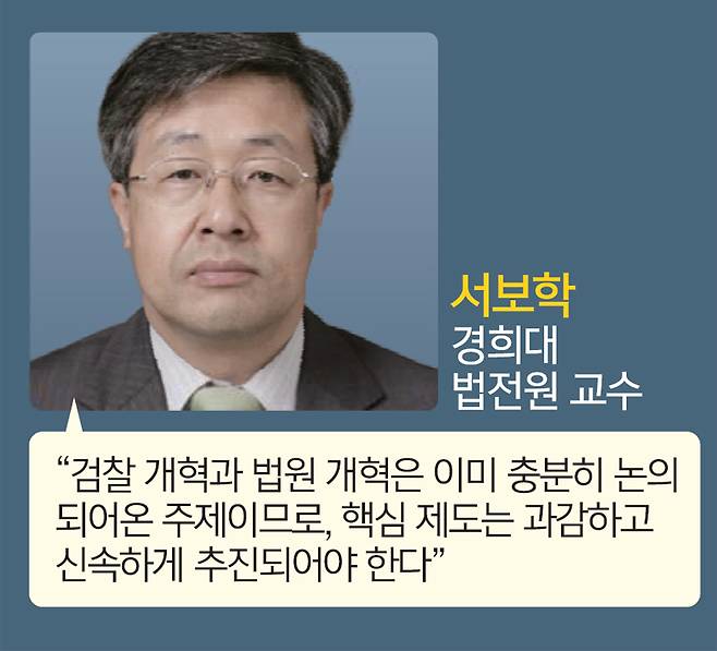 서보학 경희대 법전원 교수는 “이론적으로는 충분히 논의의 장을 열고 합의된 안을 만들어서 추진하는 게 바람직하지만, 이렇게 되면 개혁이 실패할 가능성이 높다”며 “개혁의 핵심적인 부분들은 과감하고 신속하게 추진해야 한다”고 힘줘 말했다. 서 교수는 “예를 들어 검찰 개혁에서는 입법으로 수사·기소 분리를 일거에 진행하되, 이후 관계 법령 정비 등 후속 절차 때 여러 수사기관의 수사에 이런저런 통제 장치를 둬서 엄격한 감시와 상호 견제가 이뤄지도록 하면 된다”며 “법원도 국민에 대한 사법서비스의 질을 향상시키는 등 스스로 변화하는 모습을 보여야 한다”고 당부했다.