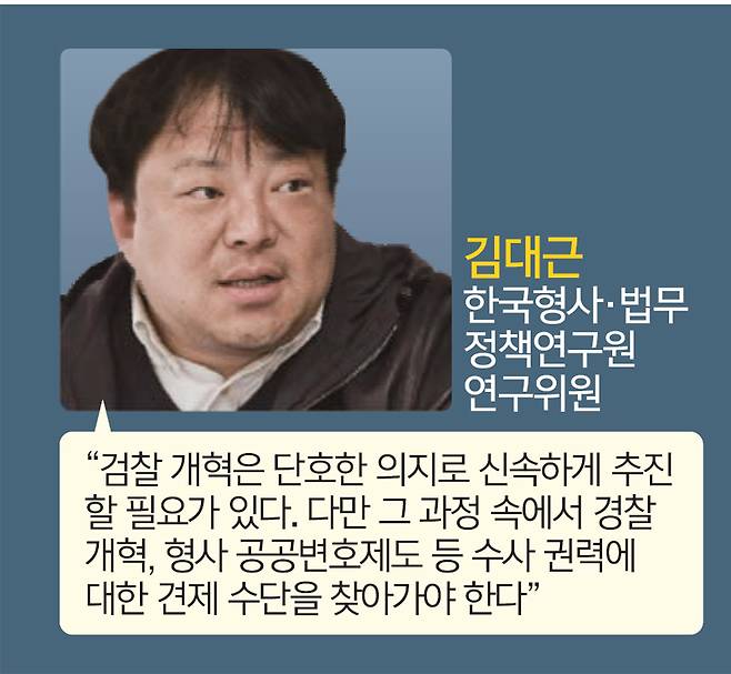 문재인정부 제2기 법무·검찰개혁위원회에 참여했던 김대근 한국형사·법무정책연구원 연구위원은 형사·사법 개혁의 성공 요건으로 “우선 국민 다수의 지지를 받아야 한다는 민주적 정당성과 합헌·합법적으로 추진해야 한다는 절차적 정당성을 갖춰야 한다”며 “그다음은 단호한 의지와 신속한 추진인데, 문재인정부 때 검찰 개혁의 경우 이게 부족해 성공하지 못했다는 평가를 받는다”고 짚었다. 김 연구위원은 “마지막으로 합리적이고 효능감 있는 대안을 제시할 수 있어야 한다”며 “수많은 가능성을 열어두고 다른 의견의 가능성들을 존중하면서 문제를 바라보고 해결하는 노력이 필요하다”고 했다.