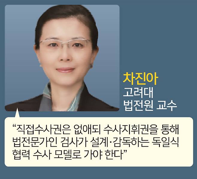 차진아 고려대 법전원 교수는 정부·여당을 겨냥해 “검찰을 악마화하면서 ‘이런 검찰을 계속 둘 것이냐’는 식으로 선동을 하면 안 된다”며 “어떤 국가기관의 일부가 잘못을 저질렀다고 해서 그걸 없애야 한다는 논리는 맞지 않다”고 질타했다. 그는 “검찰의 과도한 직접수사권 행사로 문제가 발생했다면 직접수사권을 없애는 대신 수사지휘권을 살리면 된다”며 “독일의 검사와 사법경찰관 관계처럼 상호 협력해 수사하도록 하는 방향이 맞다고 본다. 법전문가인 검사가 수사를 설계하고 기획하고 강제수사에서의 인권 침해 여부 등을 감독하면서 적법 절차를 준수하도록 수사를 하게 하자는 것”이라고 부연했다.