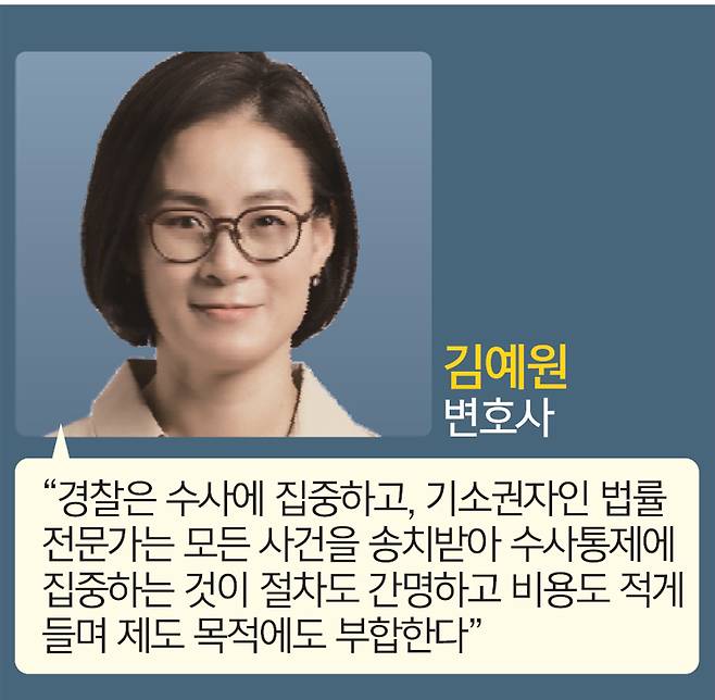 장애인권법센터 대표를 맡고 있는 김예원 변호사는 “좋은 형사·사법체계는 범죄에 대한 신속하면서도 오류 없는 대응이 가능한가로 판가름난다”며 “1차 수사기관은 신속하게 수사에 집중하고, 법률전문가인 수사통제기관이 그 오류를 줄여 제대로 기소해야 가능한데, 경찰은 수사에 집중하고 기소권자인 법률전문가는 모든 사건을 송치받아 수사통제에 집중하는 것이 절차도 간명하고 비용도 적게 들고 제도의 목적에도 부합한다”고 역설했다.