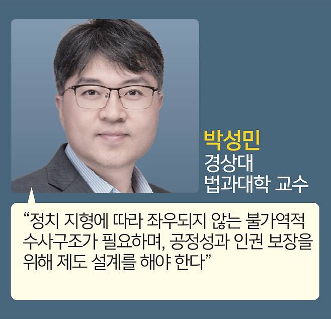 박성민 경상대 법과대학 교수는 “어떤 형태로든 정치 지형 변화에 따라 수사권 조정이나 수사구조 개혁 등이 좌우되는 일은 더 이상 없어야 한다”며 “매번 정부가 바뀐다거나 총선 이후 국회 의석수가 바뀔 때마다 이런 일들이 반복된다면 결국 그 피해는 고스란히 국민들이 떠안게 되는 것”이라고 강조했다. 박 교수는 “정치 지형에 영향을 받지 않는 불가역적인 형사·사법시스템이 필요하다”며 “그래야 우리 형사·사법 절차의 공정성과 국민의 인권이 보장될 수 있을 것”이라고 덧붙였다.