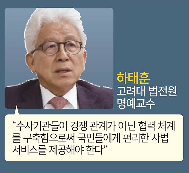 하태훈 고려대 법전원 명예교수는 수사시스템과 관련, “국가기관들은 하나의 목표를 갖고 있어야 하는데 지금은 권한을 누가 가질 것이냐를 두고 경쟁하는 관계처럼 돼 있다”며 “수사기관이든 기소 담당 기관이든 서로 협력해서 범죄자를 재판에 넘겨 처벌받도록 하는 게 공통의 목표가 돼야 국민들이 혜택을 볼 수 있을 것”이라고 했다.