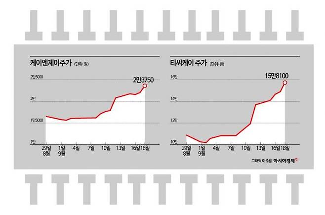 18일 금융투자업계에 따르면 이달 들어 티씨케이와 케이엔제이 주가는 각각 44.4%, 43.7% 상승했다.