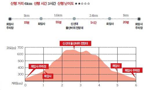 산행 길잡이 화암사 주차장에서 출발해 15분 정도 오르면 화암사 입구에 닿을 수 있다. 화암사 입구까지는 완만한 흙길로 누구나 쉽게 올라올 수 있는 길이다. 이후 수바위 방향으로 계속 오르면 1시간 정도 내로 신선대에 도착한다. 정상까지는 가파른 언덕으로 힘이 많이 들지만 길지 않다. 신선대에 도착해 가장 안쪽까지 들어가면 울산바위가 한눈에 들어오는 전망대를 만날 수 있다. 하산은 화암사 방향으로 돌아서 내려온다. 올라온 길보다 길이 잘 닦여 있어 힘들이지 않고 하산할 수 있다.