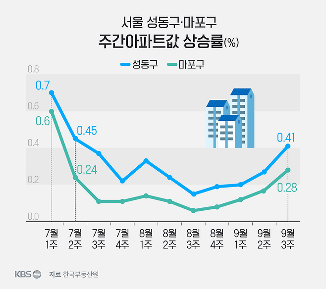 서울 아파트값 상승을 견인한 지역은 성동구입니다. 9월 셋째 주 상승률이 0.41%를 기록해 전주(0.27%)보다 0.14%P나 확대됐습니다. 7월 둘째 주 상승률(0.45%) 이후 가장 높은 수준입니다. 단연 서울 25개 자치구 가운데 가장 높은 상승 폭입니다.