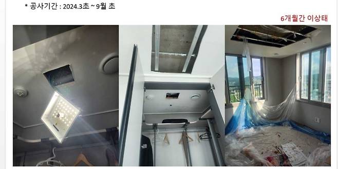 그 와중에 방 천장을 뜯고 바닥에 비닐을 덮어 둔 상태로 6개월을 보냈다고 입주자는 주장했다.
