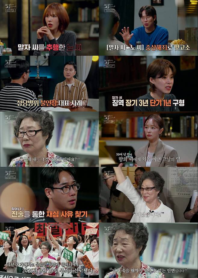 재심 과정은 험난했다. 재심 개시 확률은 20.5%, 무죄 선고 확률은 4%에 불과했다. 그러나 생생한 진술과 과거 기사, 판결문 분석을 통해 새로운 증거가 드러났다. 특히 1급 현역으로 입대한 노 씨의 기록은 당시 판결의 모순을 드러냈다. 노 씨는 사건 당일 잘린 혀를 찾아 봉합 수술을 했음에도, 검찰은 그가 언어장애인이 됐다며 할머니의 중상해죄 혐의를 강변했던 것. 2020년, 56년 만에 재심 청구가 이뤄졌다. 수백 명의 시민과 여성 단체가 모였다. 할머니는 "이 사회를 변화시키고 후손들에게 이런 오점을 남겨서는 안 된다"라고 강조했다. 그러나 1심과 항고심에서 재심은 기각됐다. 할머니는 포기하지 않고 대법원에 재 항고했고, 전국에서 1500여 건의 탄원서와 응원이 이어졌다. 웬디는 이 모든 모습을 지켜보며 "울컥한다"라고 눈시울을 붉혔다.