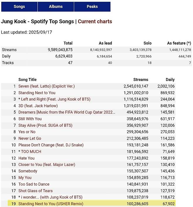 정국이 R&B 황제 어셔(Usher)와 협업한 ‘Standing Next to You-Usher Remix’가 최근 스포티파이에서 1억 스트리밍을 돌파했다. 이로써 정국의 스포티파이 개인 계정에서 1억 스트리밍을 돌파한 곡은 총 19개에 달한다. 이는 K팝 솔로 가수 최초이자 유일한 기록이다.