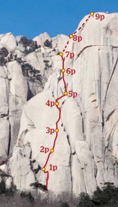 이후 볼트가 박혀 있는 5피치는 짧은 인공등반 구간이다. 6피치는 오른쪽으로 열리는 크랙이 두 개 나란히 있는 쌍크랙 구간인데 후등의 경우 오른쪽 크랙만 사용해 레이백하는 것이 쉬울 수 있다. 7피치는 슬랩 뒤로 칸테를 넘어가야 하는 구간이 있다. 이때 슬링을 길게 연결해 줄 유통을 원활히 해주는 것이 중요하다. 이후 크랙을 따라 짧게 오른쪽으로 트래버스해 이동한다. 꺾이는 부분에 3호캠을 하나 설치한 후 피아노 치듯 오른쪽으로 이동하면 된다. 재밍과 레이백으로 오르다 마지막 짧은 트래버스가 있는 8피치가 끝나고 짧은 9피치 크랙을 오르면 정상 도착이다.