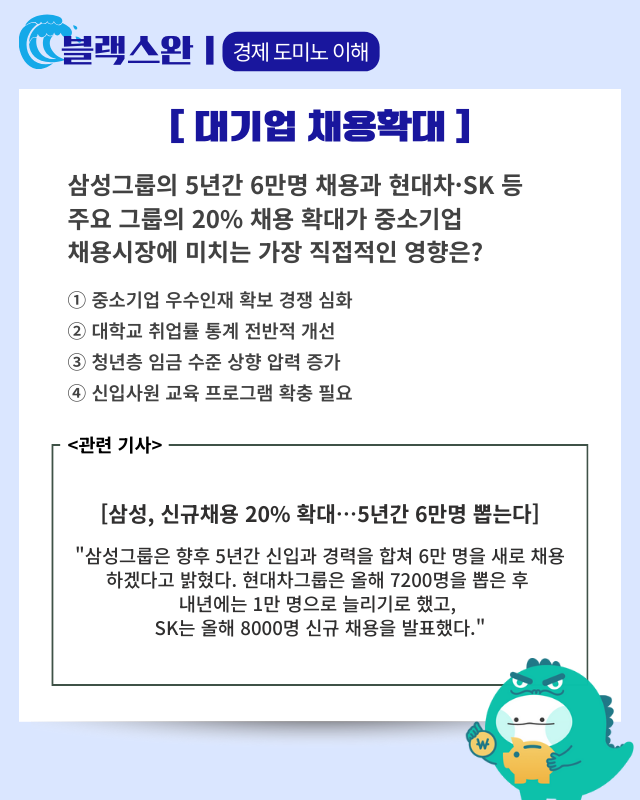 ■ 대기업 대대적 채용 확대 선언: 삼성·현대차·SK·LG 등 주요 그룹이 일제히 기존 대비 최대 20% 확대한 신규 채용 계획을 발표했다. 삼성그룹은 향후 5년간 6만명 채용으로 연평균 1만2000명을 뽑겠다고 밝혀 취준생들에게는 기회가 확대되지만 AI·반도체·바이오 등 미래 기술 인재 중심으로 선별 채용이 강화될 전망이다.