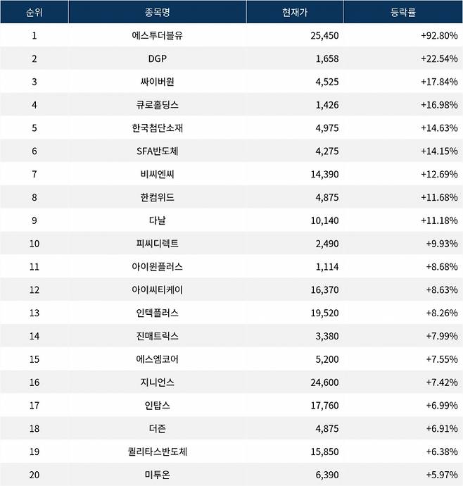 6위 SFA반도체(036540)는 현재가 4,275원으로 14.15% 상승 중이다. 7위 비씨엔씨(146320)는 현재가 14,390원으로 12.69% 상승 중이다. 8위 한컴위드(054920)는 현재가 4,875원으로 11.68% 상승 중이다. 9위 다날(064260)은 현재가 10,140원으로 11.18% 상승 중이다. 10위 피씨디렉트(051380)는 현재가 2,490원으로 9.93% 상승 중이다.