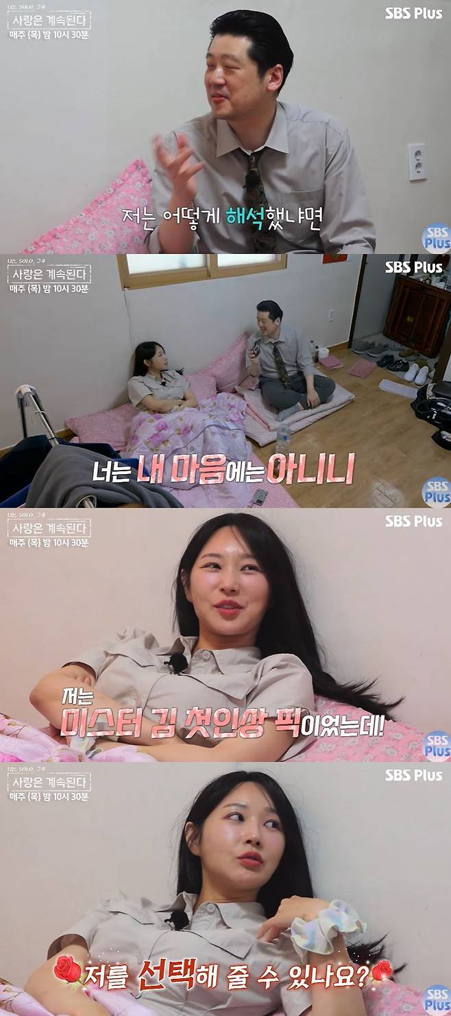 18일 방송된 SBS Plus, ENA '나는 SOLO, 그 후 사랑은 계속된다'(이하 '나솔사계')에서는 24기 옥순과 미스터 김이 대화를 나누는 장면이 공개됐다.
