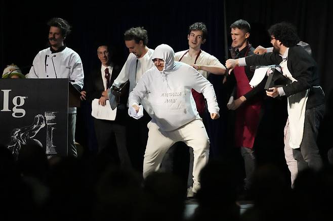 한 연구팀이 18일(현지 시간) 미 매사추세츠주 보스턴에서 열린 이그노벨상 시상식에서 영양학 부문 이그노벨상을 받고 있다.