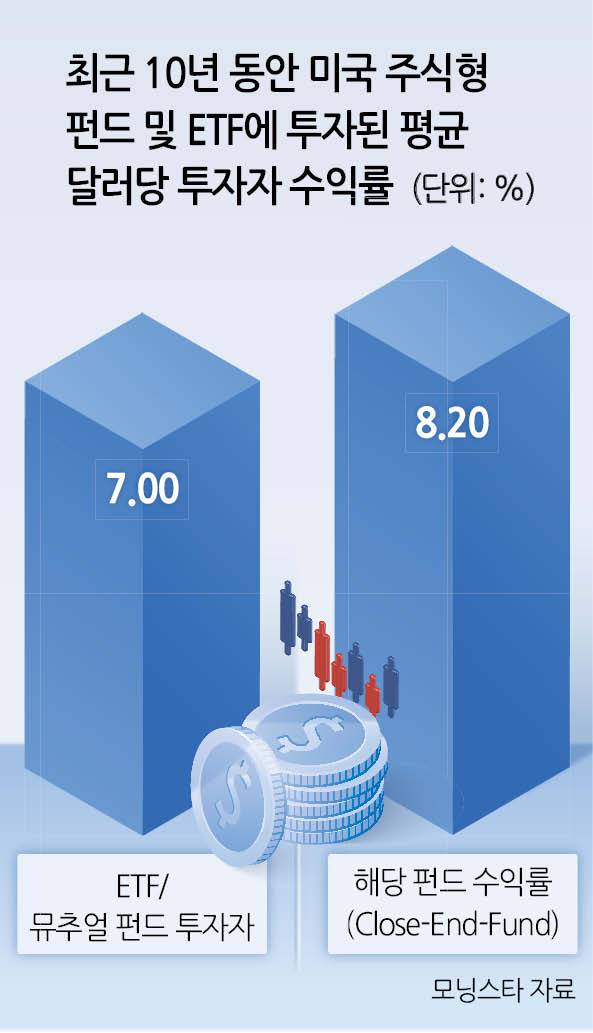 실제 신용평가사 모닝스타에 따르면 지난해 말 기준 최근 10년간 미국 주식형 뮤추얼펀드·ETF의 총수익률은 연 8.2%였지만, 투자자 수익률은 연 7.0%에 그쳤다.
