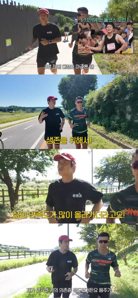 러닝 후 삶의 만족도가 80점이 됐다는 그는 "몸이 아픈 곳도 많이 사라지고 술이 주니까 아침마다 오는 고통이 없어져서 그게 너무 좋다. 내가 보기에는 음주 의존증 정도였다. (술을) 안 마시면 잠 못 자서 위스키 반 병을 하루에 마셨다. 이틀이면 한 병, 일주일이면 3병 넘게 마셨다. 근데 달리기 거리가 늘어날수록 술이 줄었다"며 만족감을 드러냈다.