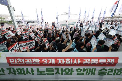 파업 참가자들은 인천국제공항공사 3개 자회사(인천공항운영서비스·인천공항시설관리·인천국제공항보안) 가운데 인천공항운영서비스 직원으로 민주노총 소속 노조원입니다.