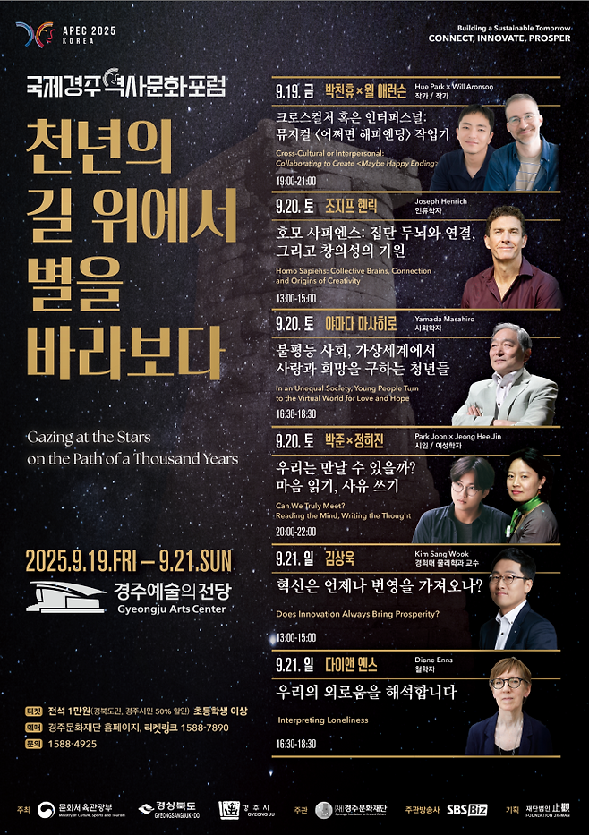 아울러 방송인 서경석, 고명환, 배우 봉태규, 작가 이슬아 등이 참여하는 야외 북토크쇼도 진행돼 포럼의 인문정신을 보다 친근하게 접할 수 있는 시간이 마련됐다. 시민들은 잔디광장에 앉아 별빛 아래에서 책과 삶에 대한 이야기를 나누며, 경주의 천년 인문정신을 체감할 수 있다.