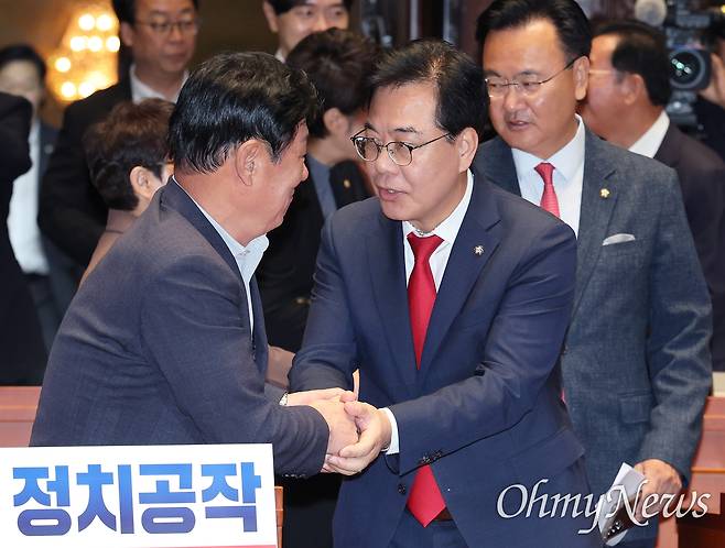 | ▲ 송언석 국민의힘 원내대표가 19일 서울 여의도 국회에서 열린 의원총회에 참석하며 동료의원과 인사하고 있다. |