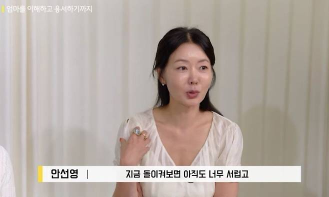 안선영은 "지금 생각해 보면 우리 엄마는 나보다 훨씬 어린 나이에 과부 돼서 혼자 애 업고 화장품 팔러 다녔다"고 말하며 엄마의 젊을 적을 설명했다. 덧붙여 "이해는 하지만 용서가 되지 않았던 마음이 더 컸다"고 솔직한 마음을 전하기도 했다.