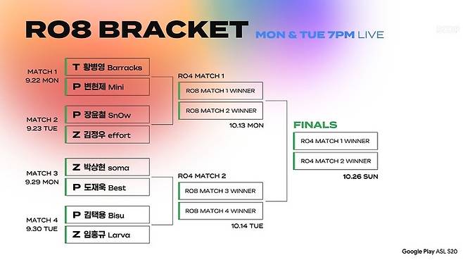 'Google Play ASL 시즌 20' 8강은 7전 4선승제로, 양 선수가 맵을 하나씩 선택해 진행된다. 경기는 서울 대치동 '프릭업 스튜디오'에서 진행되며, 현장 관람 티켓은 매주 목요일 오후 5시부터 티켓링크 사이트에서 선착순으로 예매할 수 있다. 대회 생중계 및 VOD 다시보기는 SOOP e스포츠 페이지에서 볼 수 있다.