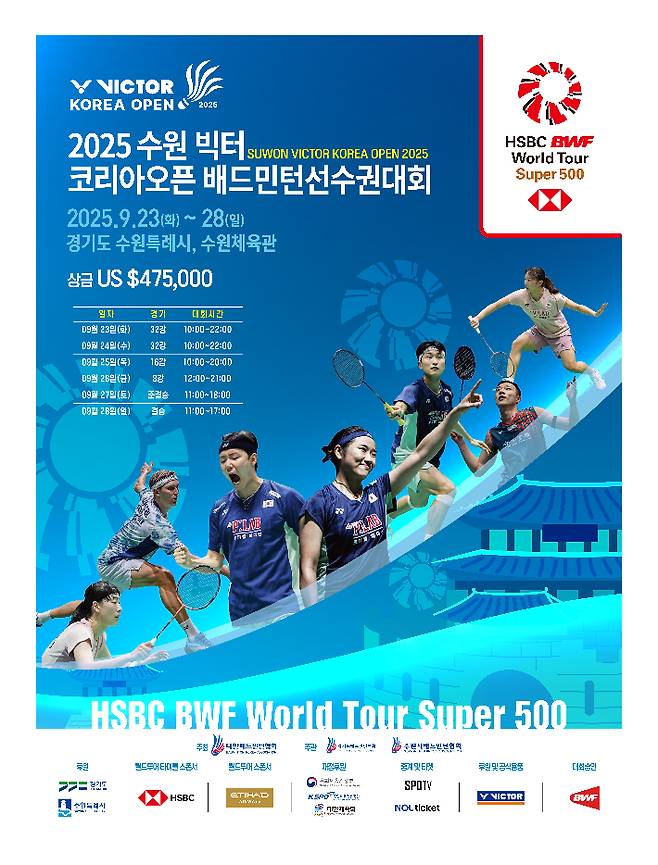 대한배드민턴협회는 19일 "2025 수원 빅터 코리아오픈배드민턴선수권대회-세계배드민턴연맹(BWF) 월드 투어 슈퍼500을 23일(화)부터 28일(일)까지 경기도 수원시 수원종합운동장 실내체육관에서 개최한다"고 밝혔다. 남녀 단식과 복식, 혼합 복식까지 5개 종목이 펼쳐진다.