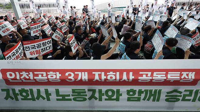 파업 참가자들은 인천국제공항공사 3개 자회사(인천공항운영서비스·인천공항시설관리·인천국제공항보안) 가운데 인천공항운영서비스 직원으로 민주노총 소속 노조원입니다.
