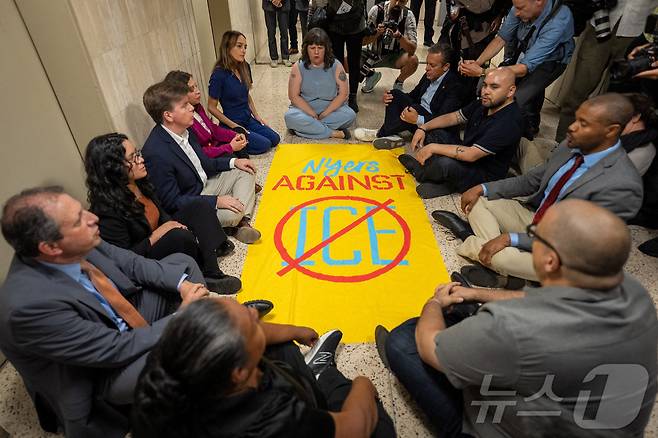 (뉴욕 로이터=뉴스1) 윤다정 기자 = 미국 민주당 소속 뉴욕주 하원의원들이 18일(현지시간) 뉴욕 맨해튼의 미국 이민법원 내 수감시설의 환경 점검을 거부당한 후 항의하며 연좌 시위를 하고 있다. 2025.09.18.