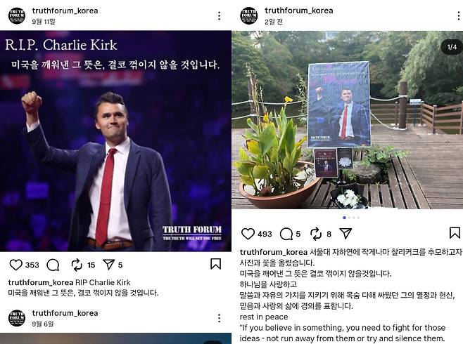 19일 오전 방문한 서울대학교 캠퍼스에는 커크를 추모하는 내용의 포스터들이 부착된 추모 공간이 설치돼 있었다. 커크가 오른 손을 치켜든 사진 위에 그의 말이 새겨진 형태로, 미국 성조기와 태극기도 나란히 꽂혀 있었다. 흰 국화꽃이 그려진 포스터에는 "(커크는) 말씀과 자유의 가치를 지키기 위해 용감하게 싸웠다. 그의 믿음, 용기, 헌신과 사랑을 기억하겠다"라는 문구도 적혀 있었다.