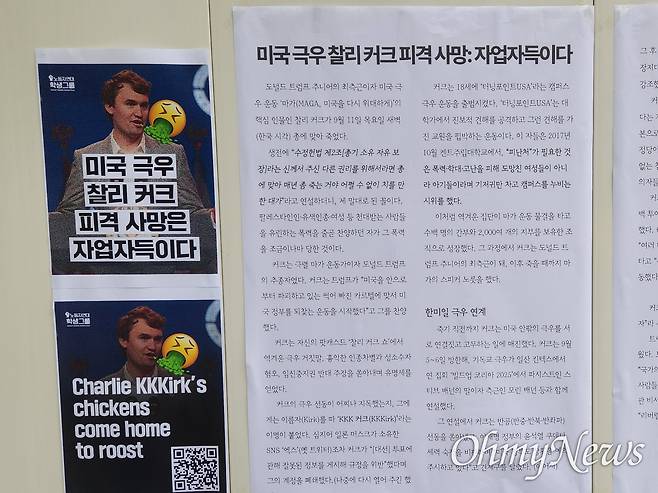 | ▲ 19일 오전 서울대에 마련된 찰리 커크 추모 공간 맞은편 공사장 벽면에 커크의 생전 행적과 혐오 발언들을 비판하는 대자보가 게시돼있다. |