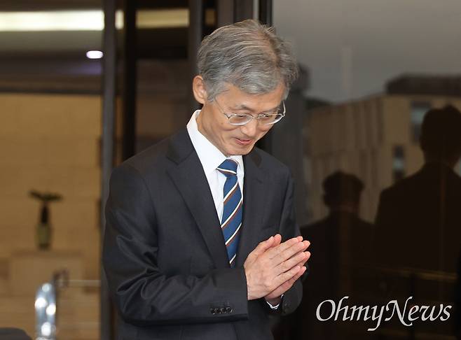 | ▲ 조희대 대법원장이 17일 오후 서울 서초구 대법원 청사에서 퇴근하던 도중 최근 한덕수 전 국무총리와 이재명 대통령의 공직선거법 위반 사건 처리 논의 여부를 묻는 기자들의 질문에 두 손을 모으며 답변을 사양하고 있다. |