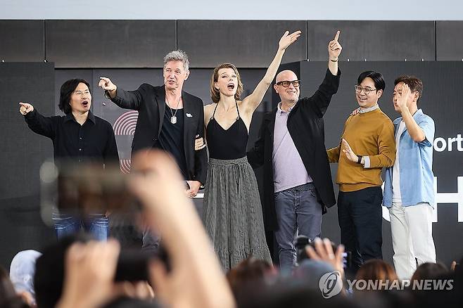 (부산=연합뉴스) 류효림 기자 = 박호성 PD(왼쪽부터), 폴 W.S. 앤더슨 감독 겸 PD, 배우 밀라 요보비치, 애드리언 그런버그 감독, 폴 W.S. 앤더슨 감독, 문봉섭 작가, 주방옥 PD가 19일 부산 해운대구 우동 영화의전당에서 열린 제30회 부산국제영화제 '프로텍터' 야외무대인사에서 관객들에게 인사하고 있다. 2025.9.19