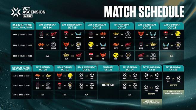 이번 어센션 퍼시픽은 총 12일간 진행된다. 조별 리그는 오는 10월 14일부터 21일까지, 플레이오프는 오는 10월 22일부터 26일까지 열린다. 상위 브래킷 결승전은 10월 25일, 하위 브래킷 결승전은 10월 26일 열린다.