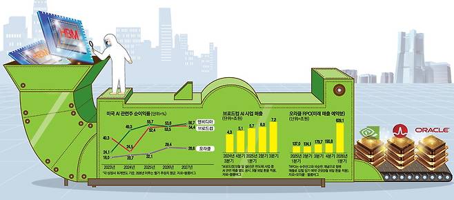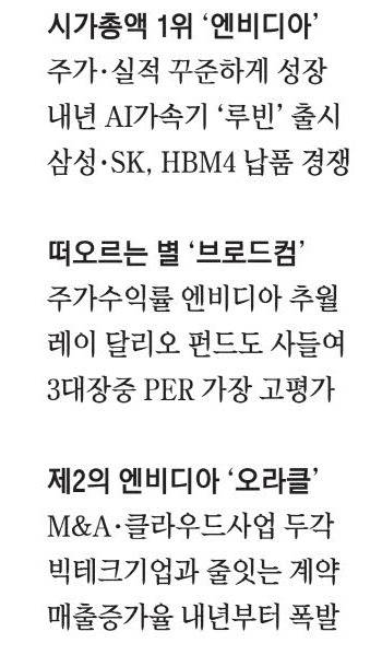 최근 AI 사업에서 두각을 나타내는 엔비디아는 시가총액 1위이며 브로드컴(7위), 오라클(12위) 모두 상위권이다. K반도체가 코스피를 견인하듯 이들 삼총사도 미 시장의 신고가를 이끌 것이란 전망이다. 월가 관계자는 "헤지펀드들이 미국 AI 관련주를 싹쓸이하고 있다"며 "공격적 투자자라면 고평가 논란에도 더 높은 성장률이 예상되는 이들 주식 비중을 높일 필요가 있다"고 전했다.