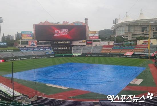 19일 오전부터 수도권 전 지역에 비가 내리기 시작했다. SSG랜더스필드에도 일찌감치 대형 방수포가 깔렸다. 오후에도 비가 계속 내리는 가운데 기상청에 따르면 늦은 저녁까지 굵은 빗방울이 내릴 것으로 예보됐다.