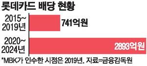 19일 금융감독원 전자공시시스템에 따르면 롯데카드는 2020년부터 2024년까지 5년간 총 2893억원을 배당했다. 이는 MBK파트너스가 인수하기 전인 2015년부터 2019년까지 5년간 집행한 741억원에 비해 4배 늘어난 수준이다.