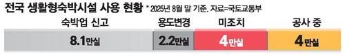 나머지 준공 물량 중 8만1000실은 숙박업 신고가 이미 완료됐고 2만2000실은 오피스텔 등으로 용도가 변경됐다. 원래 방침대로라면 미조치 4만실과 준공 중인 4만실 등 8만실은 이달 말까지 조치가 완료되지 않으면 2027년 이후부터 이행강제금(건축물 공시가격 10%)을 매년 내야 한다. 개인별로는 수천만 원에 달하는 과태료다.