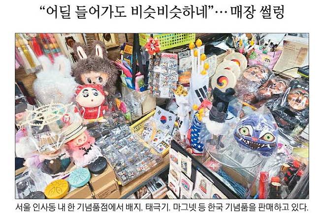 K팝과 '케이팝데몬헌터스'의 인기로 한국 굿즈 구매가 크게 늘고 있지만 인사동에서 판매하는 기념품들은 외면받고 있다.