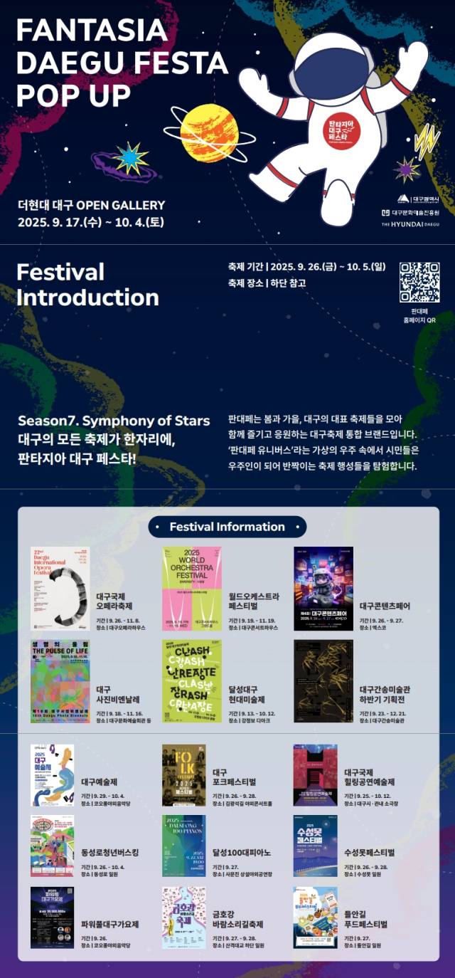 대구의 대표 축제들이 함께 열리는 '판타지아대구페스타'(이하 판대페)를 소개하는 팝업 전시가 더현대대구 지하 1층 오픈갤러리에서 10월 4일까지 열리고 있다.