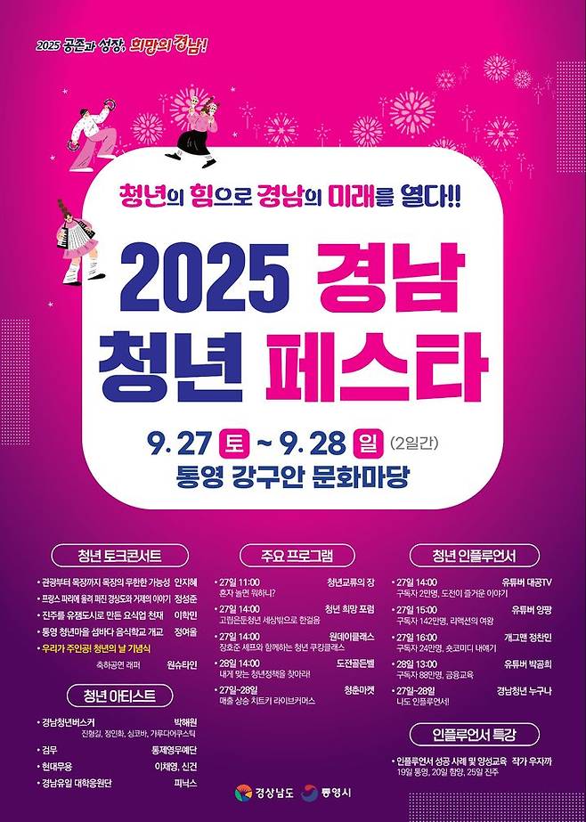 경남도는 청년의 날 및 청년주간을 맞아 오는 27일부터 28일까지 통영 강구안 문화마당 일원에서 '2025 경남청년페스타'를 개최한다.