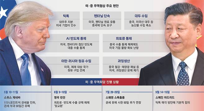 미국과 중국은 앞선 세 차례 무역협상에서 구체적인 진전을 이루지 못했다. 지난 5월 스위스 제네바에서 열린 첫 무역협상에서는 115%포인트씩 관세율을 낮추고 관세 부과를 90일간 유예하기로 했고, 다음달 열린 영국 런던 회담에서는 제네바 회담 합의를 이행하기 위한 ‘기본 틀(framework)’을 마련했다. 또 희토류 수출 제한 해제와 반도체 수출 규제 해제를 ‘맞교환’하기로 합의한 바 있다.